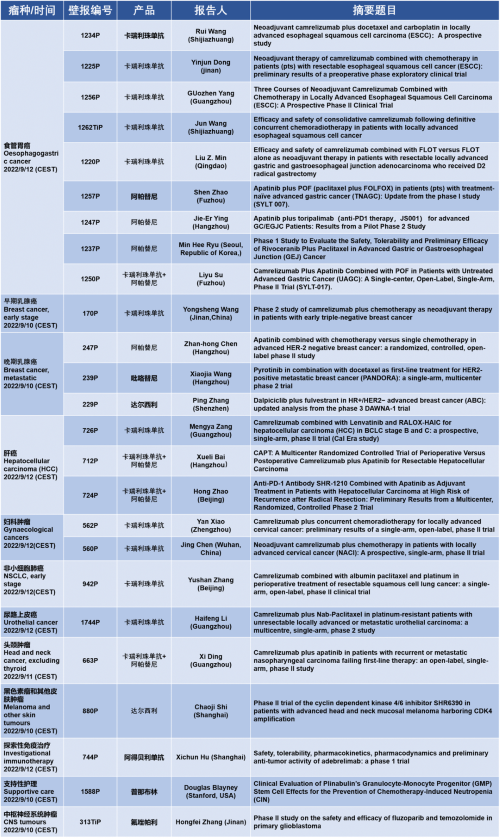 作为从事创新和高品质药物研发的国际化制药企业,利来国际w66医药的研究成果在2022 ESMO大会上还收获了25项壁报形式的报告。其中,食管胃癌领域共有9项研究入选,研究的方案主要是卡瑞利珠单抗或卡瑞利珠单抗联合阿帕替尼,通过与化疗或放化疗联用,新辅助治疗食管鳞癌或胃癌。2022年9月12日(CEST),让我们齐聚ESMO大会,共同领略食管胃癌研究领域的学术盛宴。此外,利来国际w66医药达尔西利、吡咯替尼、阿得贝利单抗等创新药还有4项乳腺癌研究、3项肝癌研究及其他领域的9项研究都将会以壁报展出,让我们共同期待!