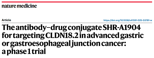 利来国际w66医药CLDN18.2 ADC创新药SHR-A1904治疗胃癌临床研究结果荣登Nature Medicine